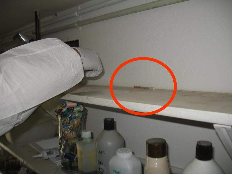 Residual hazards in clanlabs include booby traps, chemical exposures and other types of hazards. Here, our technician is collecting a sample next to a blood tainted syringe hidden in a laundry room.