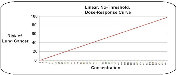 To satisfy the unsupported philosophical end adopted by the US EPA (and many other groups), they accepted a model known as the "Linear, No-Threshold, Dose-Response Curve." This model begins with the a priori rule, that even one solitary atom of radon, present in a room the size of the Earth will carry a quantifiable risk of dying from lung cancer. To say that the proposition is laughable, would be an insult to comedians. The model is graphically represented below, wherein the dose-risk curve is artificially forced through "zero" at one atom of radon, on the planet Earth.