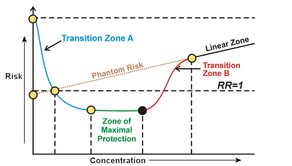 Radon is not magical. There is a dose above which we begin to see the risk of lung cancer increase, and as we increase that dose, the risk too increases. Paradoxically, however, at very high doses, the risk goes down, not up. Similarly, there is a dose at which there is an apparent beneficial effect, and the risk of lung cancer is less than those people with "no" radon exposure. This effect is known as "hormesis." As it turns out, the concentrations of radon normally encountered in residential settings is in this category, and the best of scientific studies show that residential radon is not only not harmful, but appears to impart an hormetic effect.1 To date (in 2021), there are no epidemiological studies that reliably demonstrate a positive dose - response relationship between normal residential radon concentrations and the incidence of lung cancer. 2, 3, 4, 5, 6, 7, 8, 9, 10, 11, 12